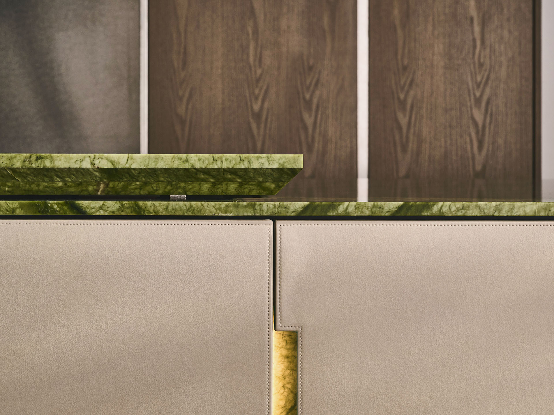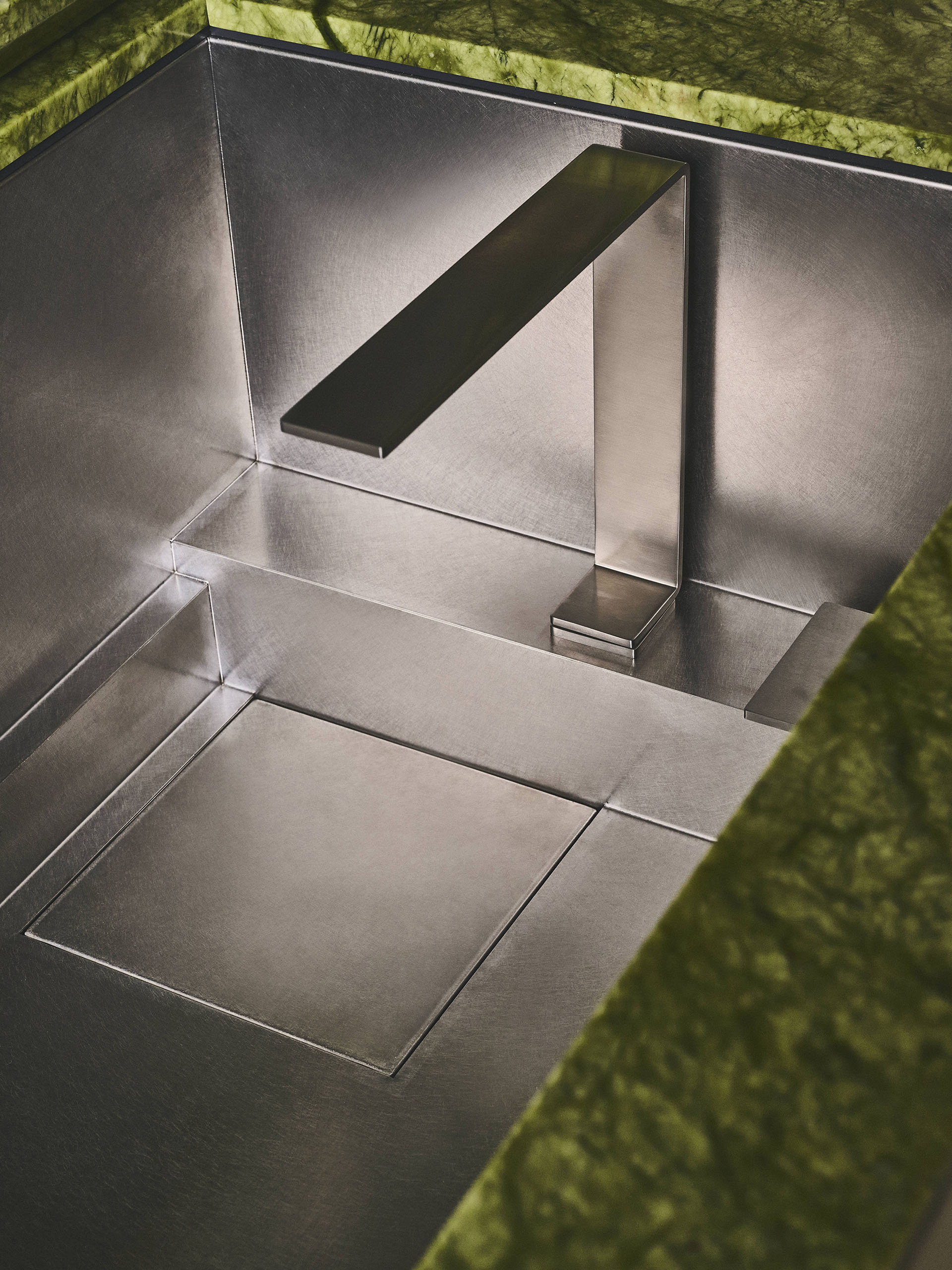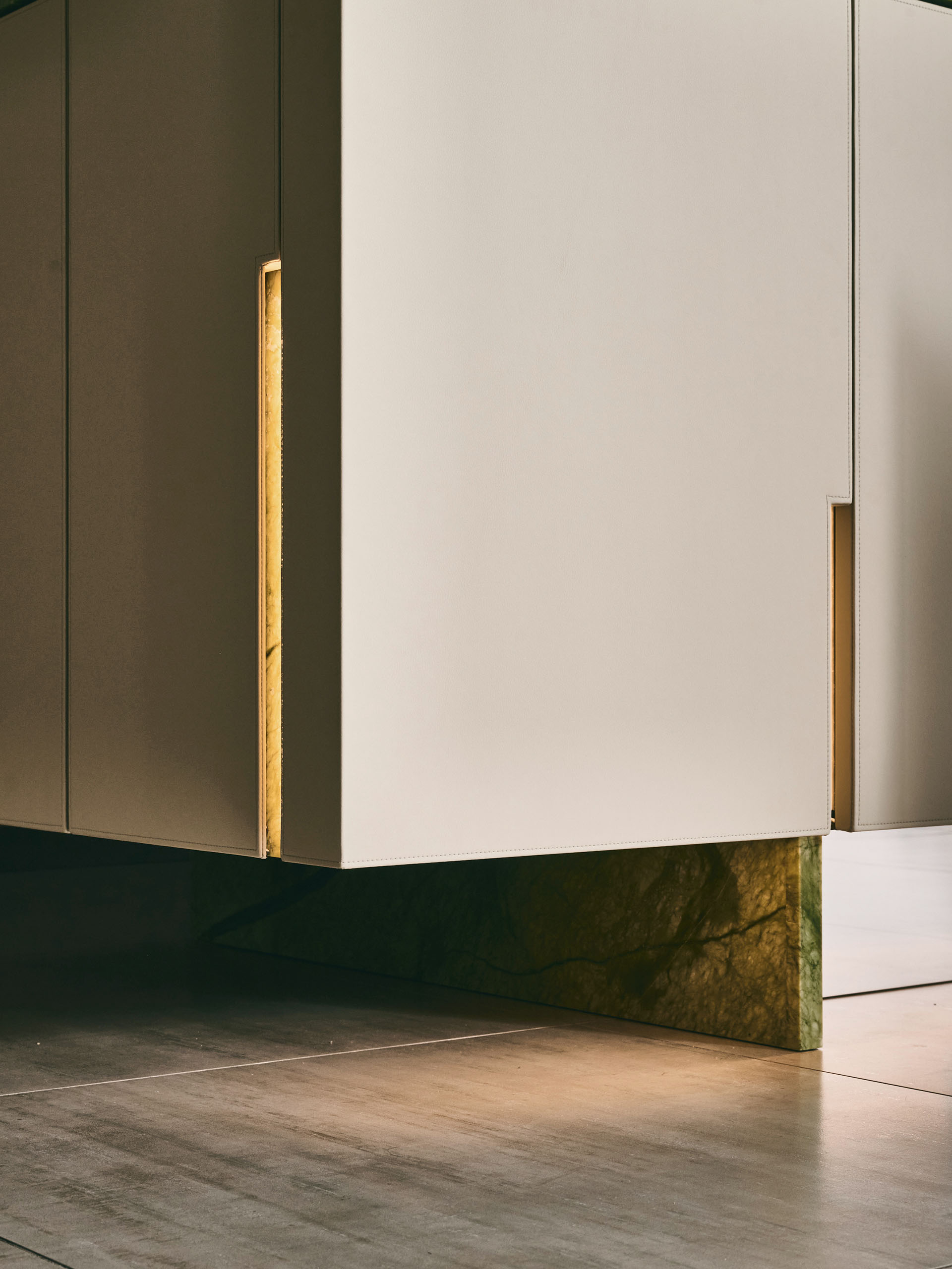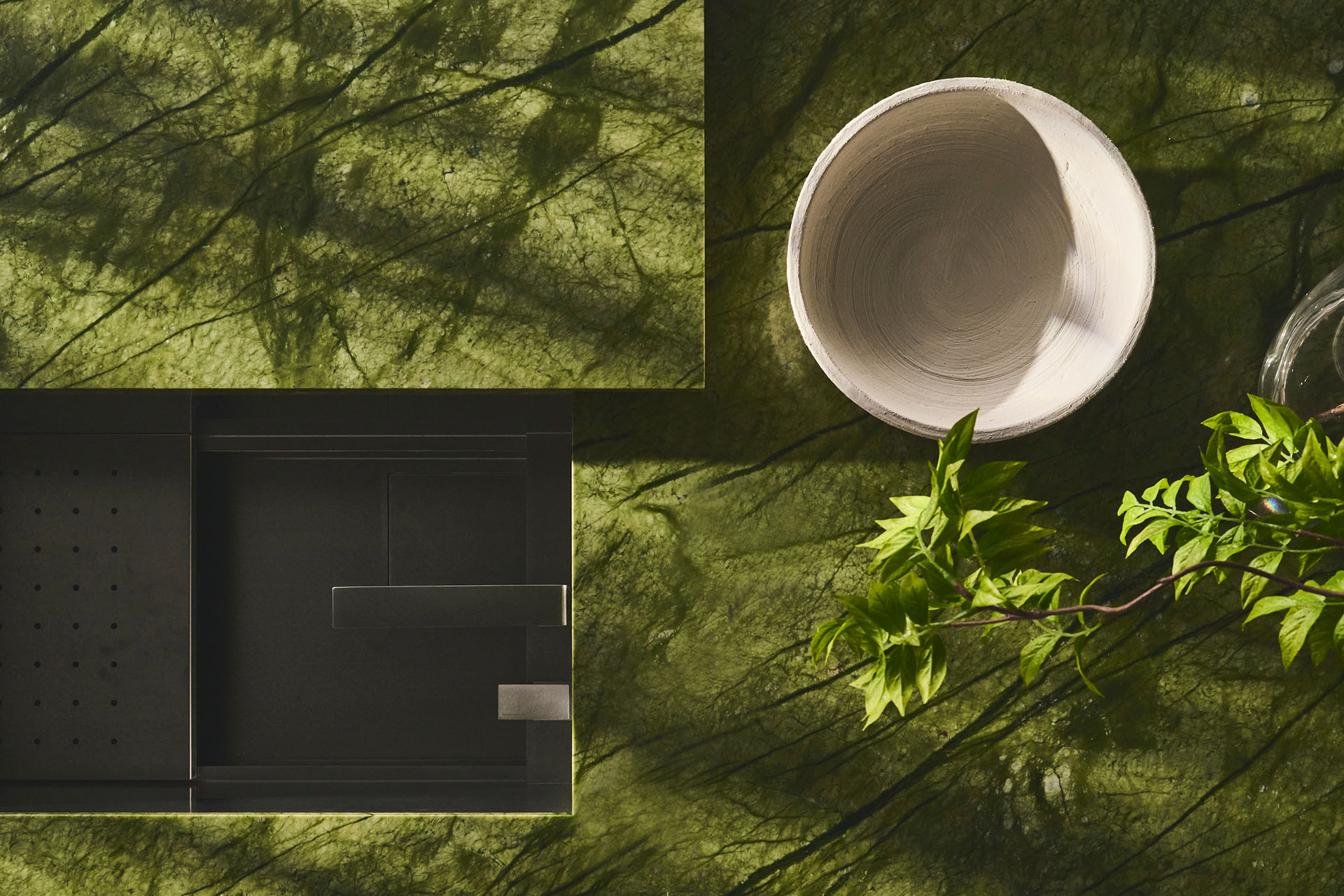 将水龙头降至与洗手池齐平,并通过可移动的大理石顶板遮盖洗手池,从而最大限度地减少生活气息。前厨房与后厨房作为统一的设计相互呼应,在“展示厨房”与“使用厨房”之间进行柔和区分,呈现出一种融入空间的新厨房形态。