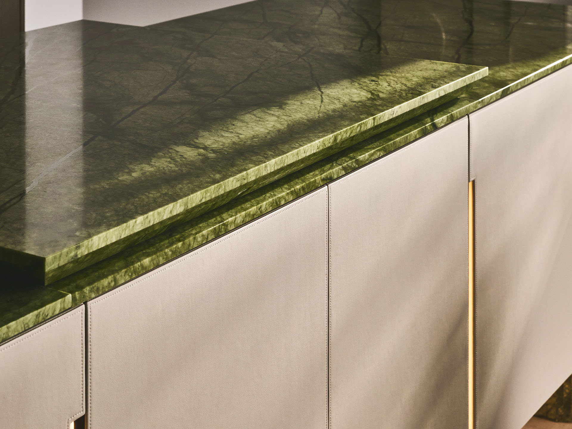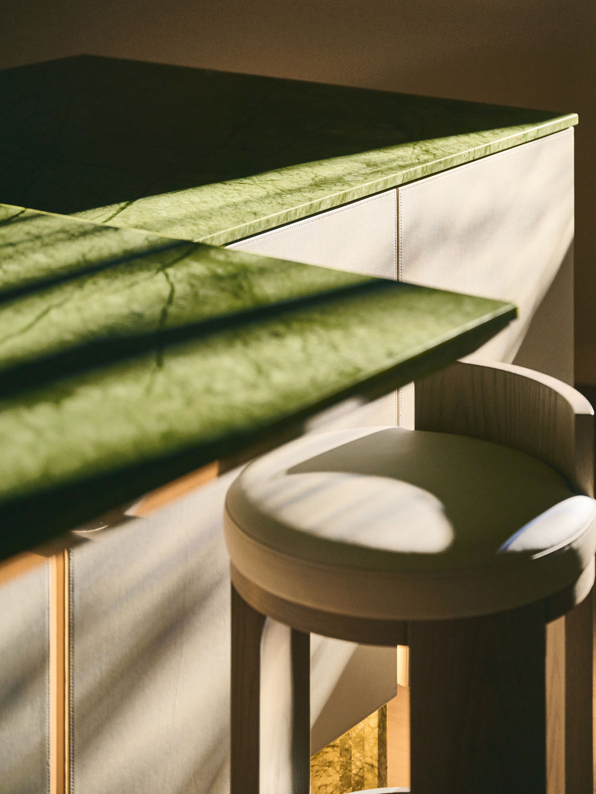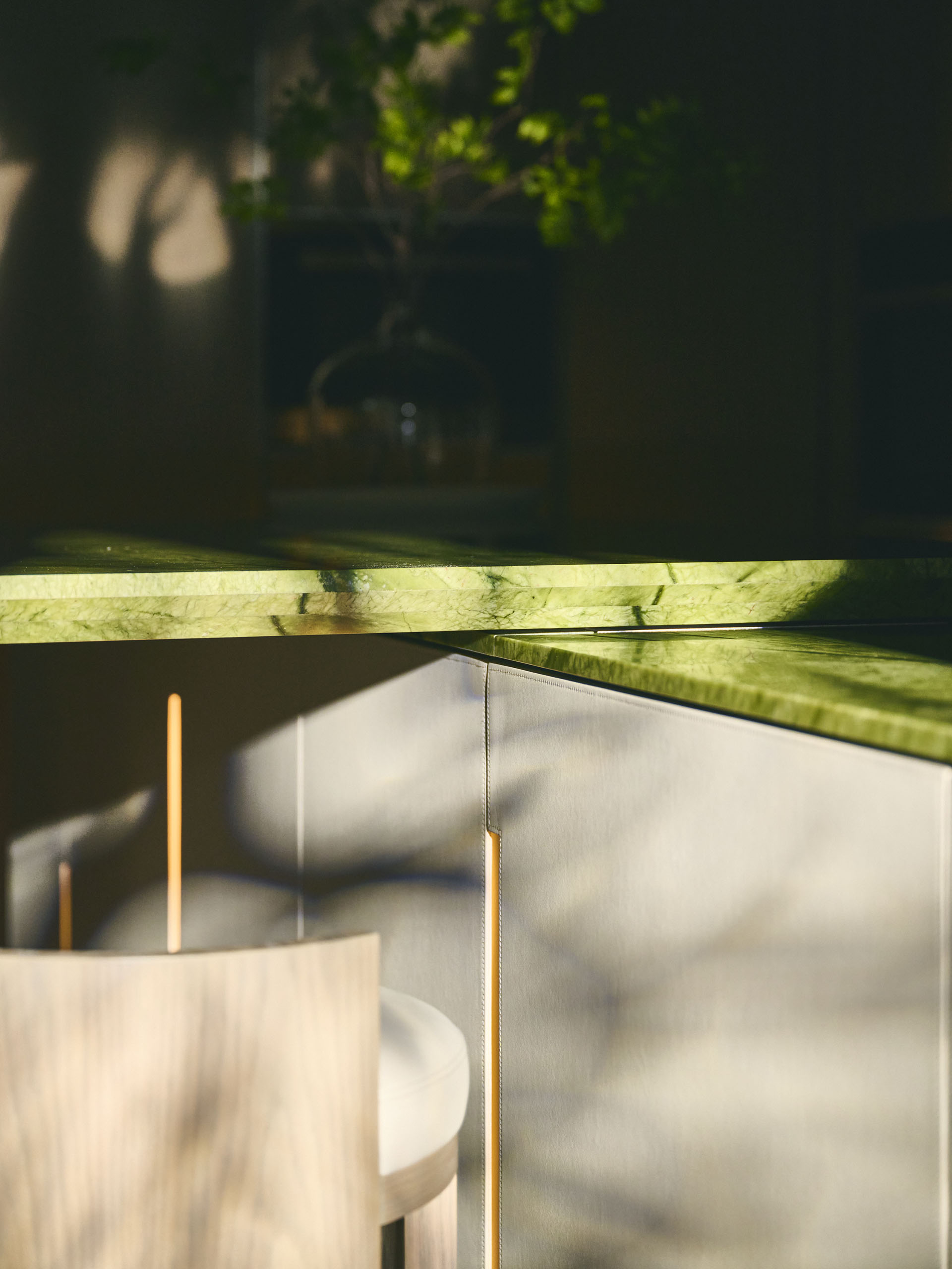 水栓はシンクのレベルまで落とし込み、可動式の大理石天板によってシンクを覆い隠す構成とすることで、生活感を極力排除。フロントキッチンとバックキッチンがひとつのデザインとして呼応し、「見せるキッチン」と「使うキッチン」を緩やかに分けながら、空間に溶け込む新しいキッチンの在り方を提示した。