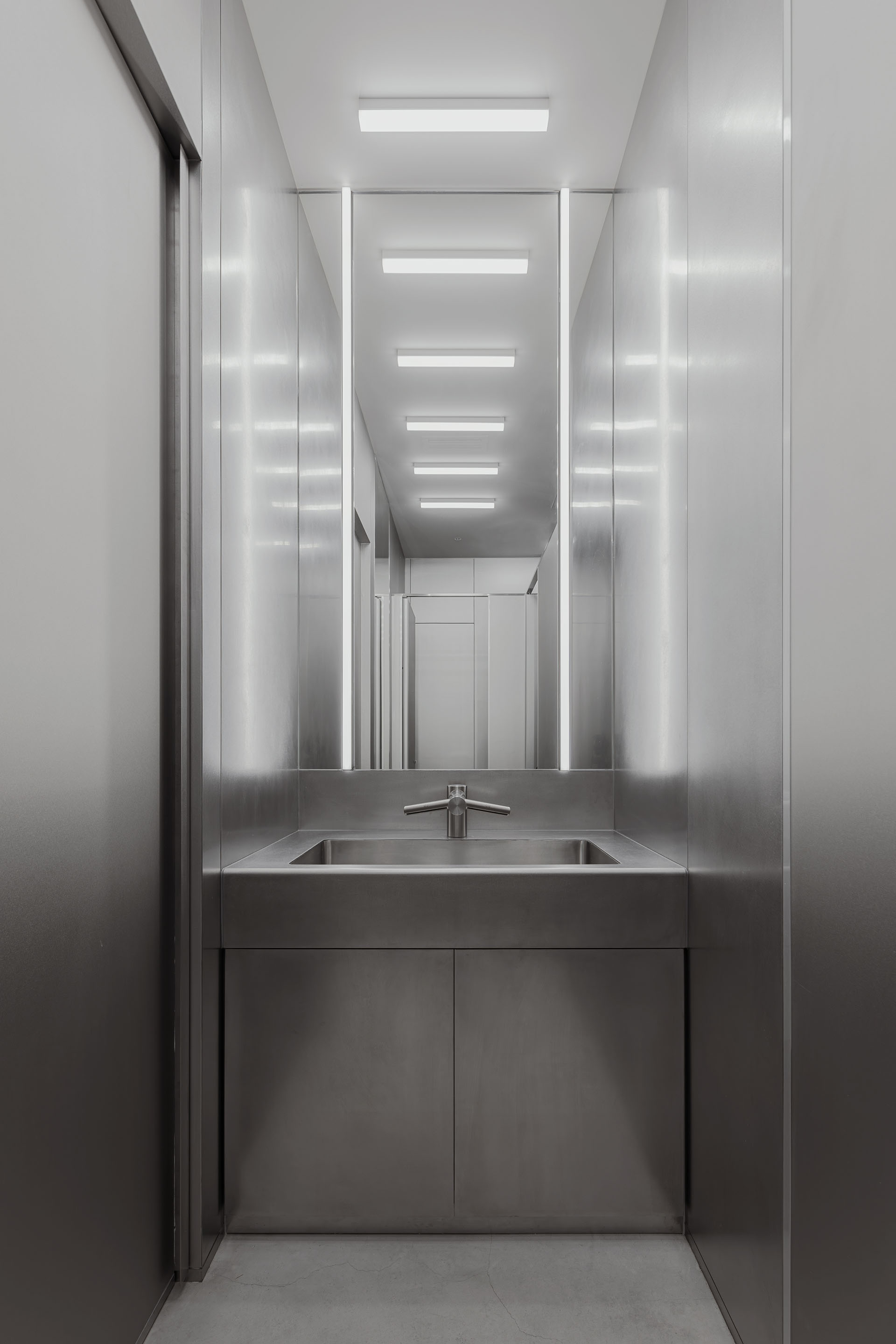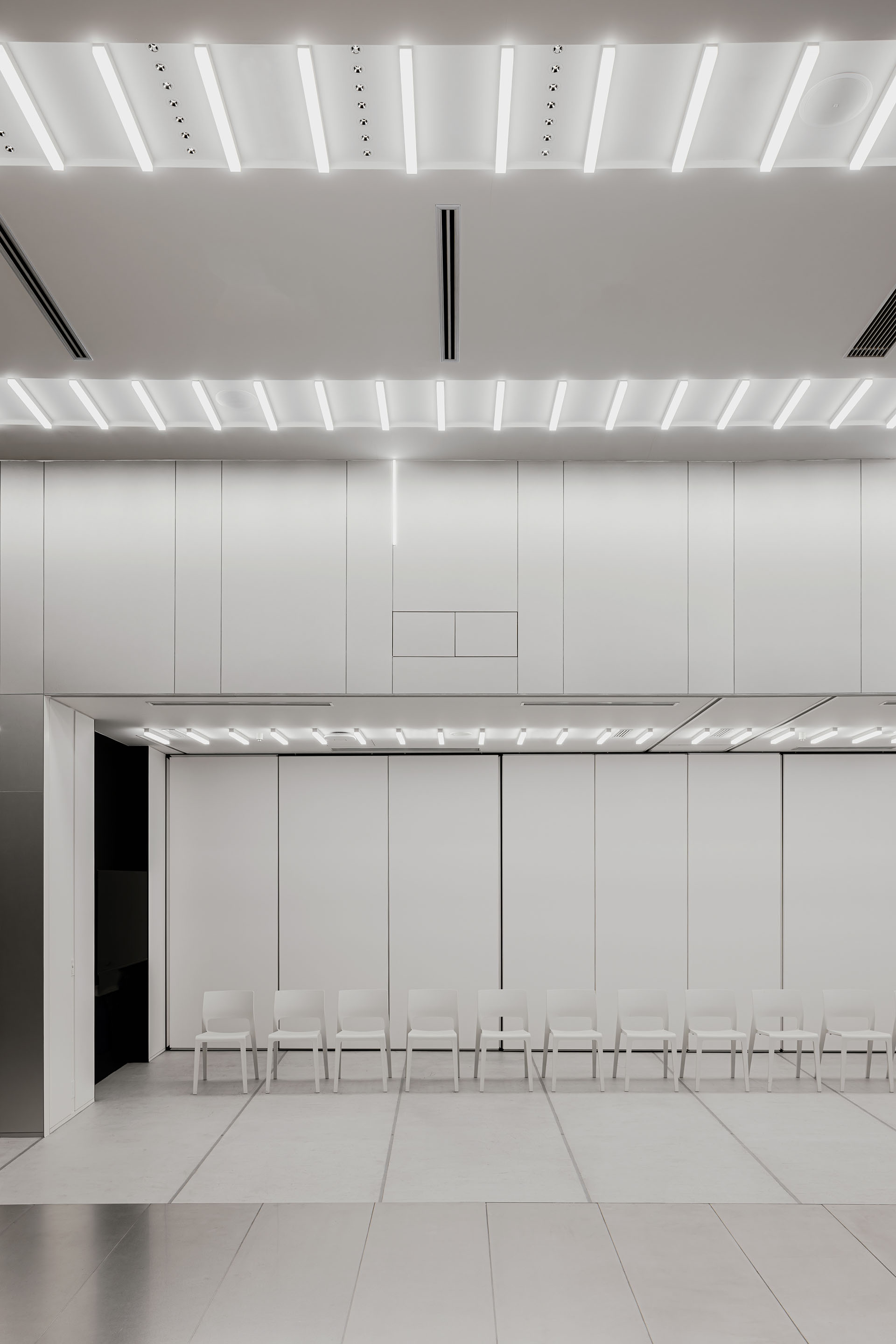 结合能够彰显PowerX一个性的空间需求,我们甚为重视的是将电可视化的“照明”设计。将适用于蓄电池内部的构成落实到照明计划,通过在展厅区域、洗手间、会议室等主要天花板上均匀排列简洁地表现了以蓄电池事业为核心的PowerX的独特个性。后区办公室天花板也是同样的构思,被分割的展厅和办公室有了一体感。