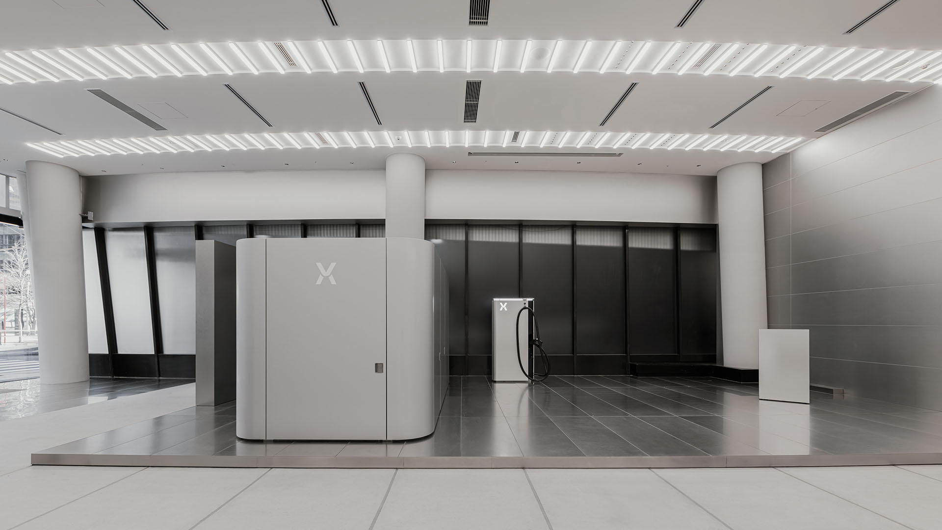 パワーエックスのミニマルなプロダクトに呼応するように削ぎ落とされた空間構成はブランドの個性をより増幅させる。