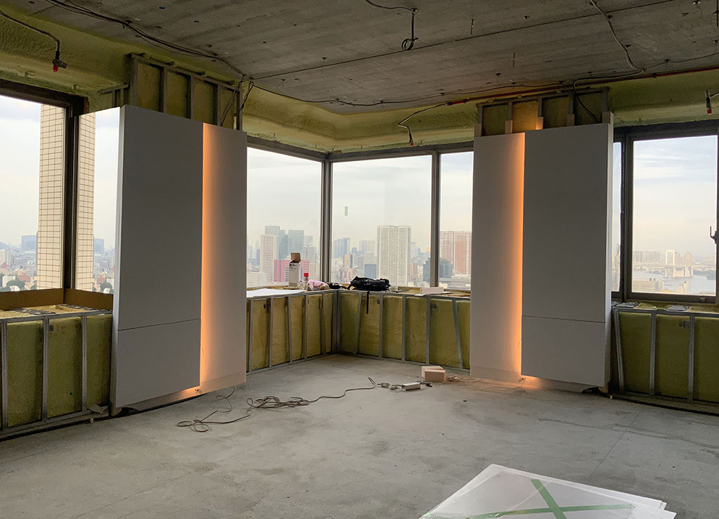 The location on the upper floors of a tower apartment building offers a panoramic view of Tokyo Tower, Sky Tree, and Rainbow Bridge, which are representative of Tokyo cityscape.