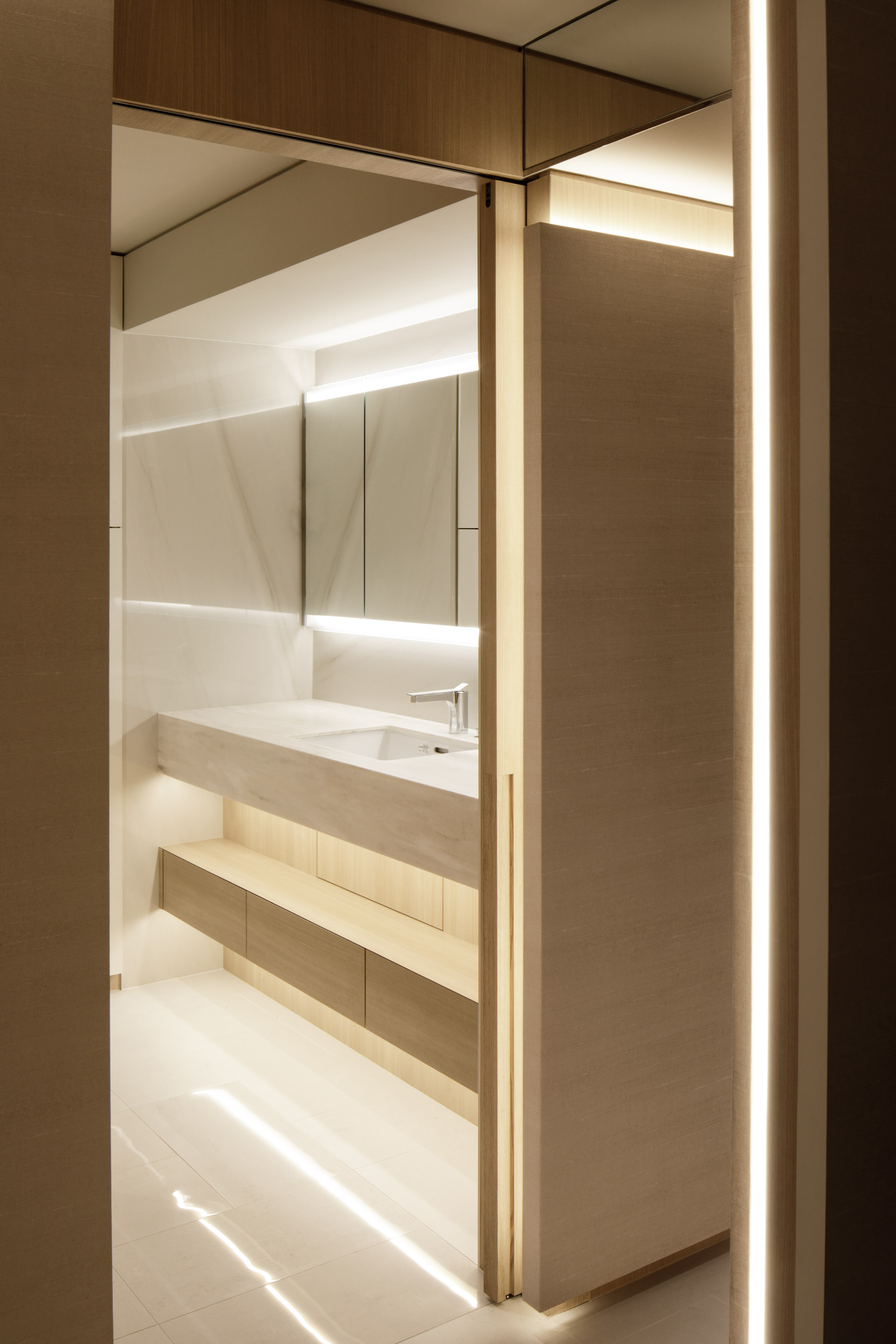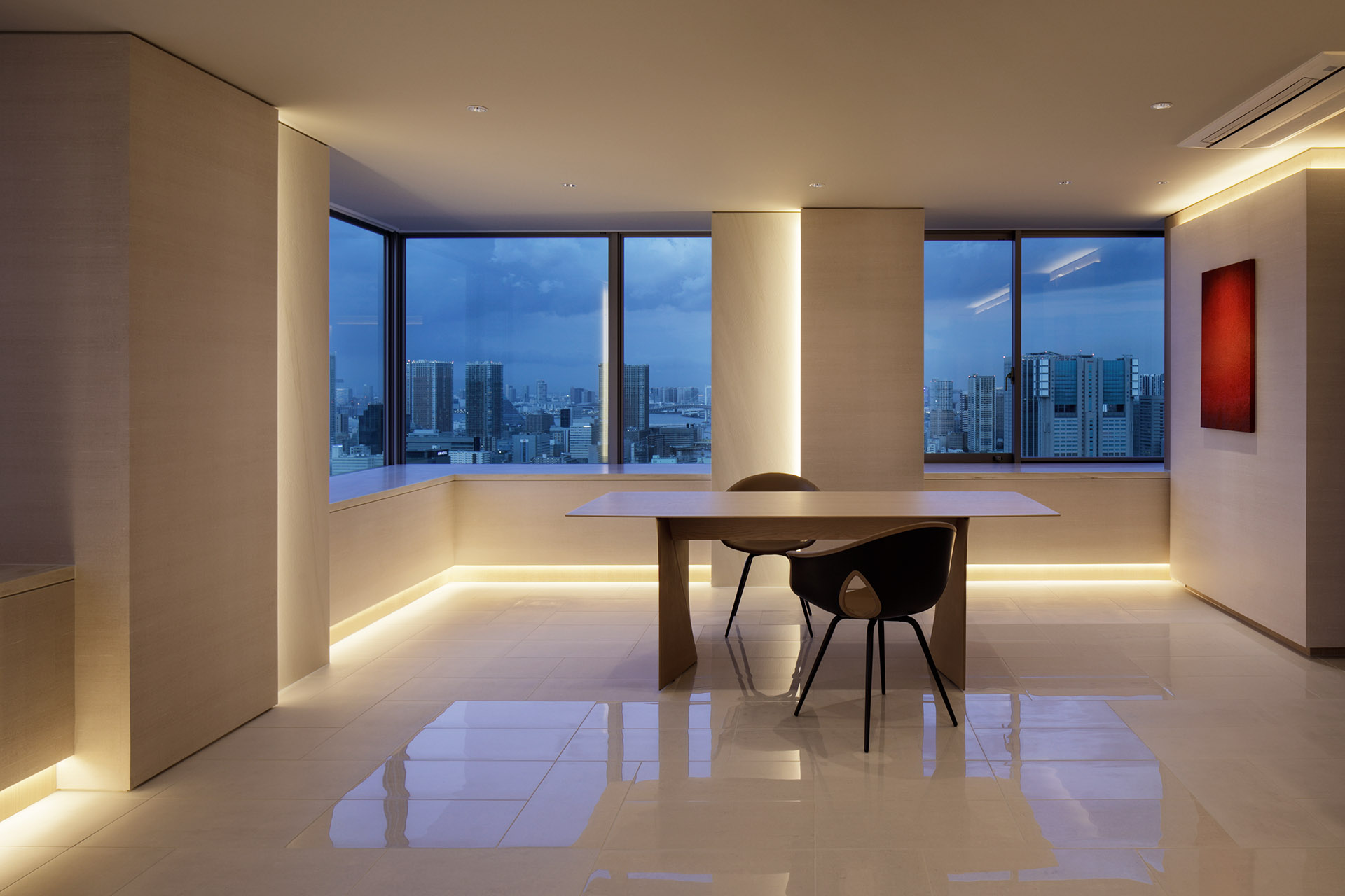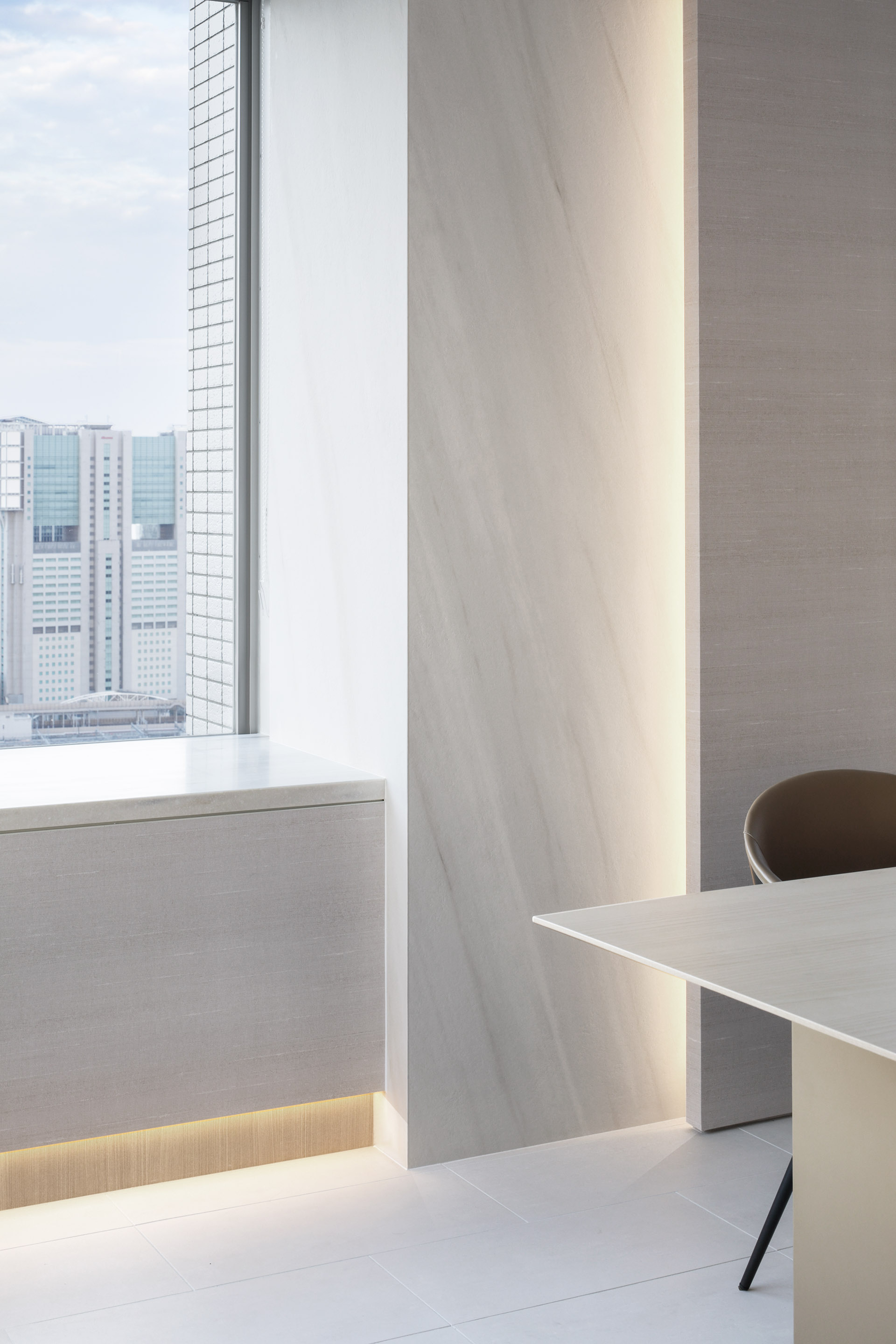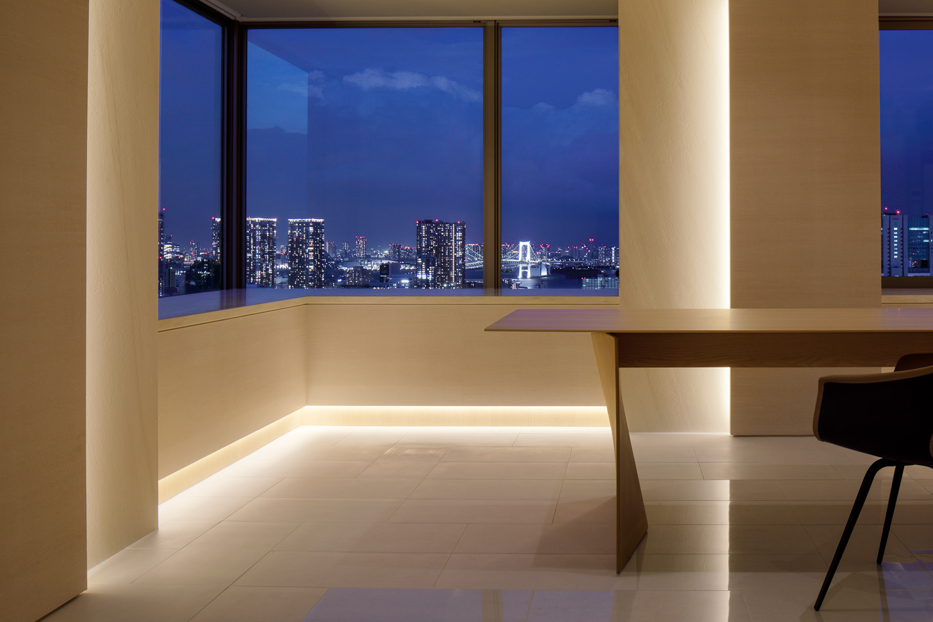 The frame of light is created from the light leaking through the gap between the two layers of panels, and by scattering them in various places, soft light covers the entire space, creating a relaxation space that offers a respite from the busy day.