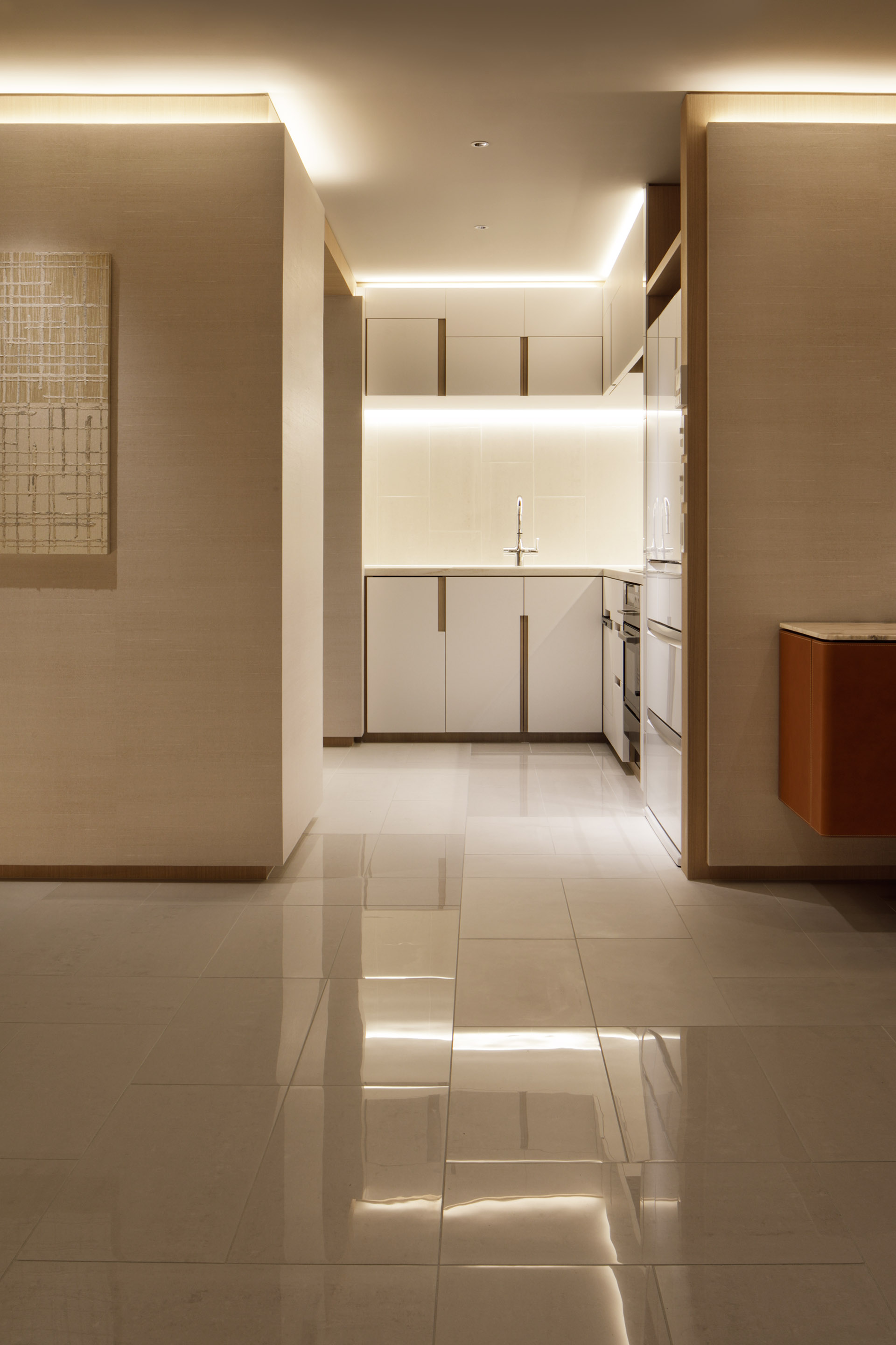 入口设置狭长的通道,与之宽敞的客厅餐厅形成对比,起到放大空间的视觉冲击。